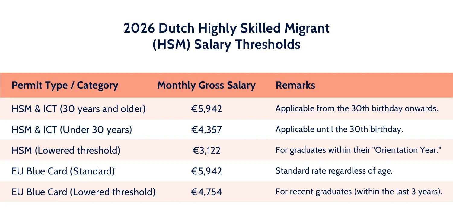 Salary thresholds under the HSM scheme are indexed annually based on negotiated wage developments. The 2026 increase reflects the impact of inflation on HSM salaries and broader labor market trends in the Netherlands.